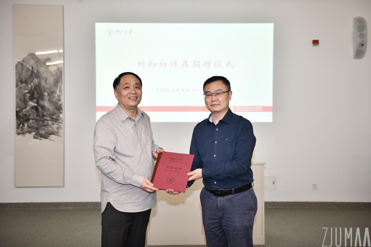 葉民為捐贈方頒發(fā)捐贈證書,對劉維陽先生的慷慨捐贈和周岳平先生的牽線搭橋表示誠摯感謝。他表示,劉先生的作品兼具傳統(tǒng)精髓與形式創(chuàng)新,對中國山水畫的發(fā)展產(chǎn)生了重要影響。此次捐贈將推動浙江大學(xué)現(xiàn)當(dāng)代書畫研究,為學(xué)校更好地彰顯文化育人特色,服務(wù)立德樹人根本任務(wù)提供大力支撐。學(xué)校也將不負(fù)所托,收藏好、保存好、利用好捐贈品,使其在學(xué)校的實物教學(xué)、文化建設(shè)中發(fā)揮最大作用。